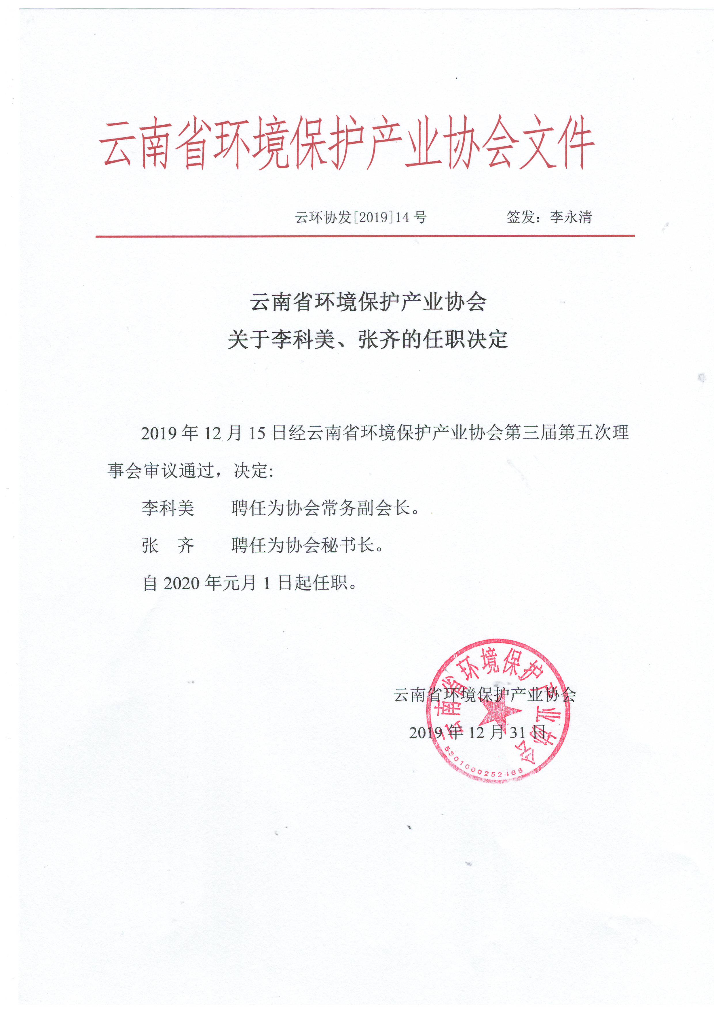 云南省環(huán)境保護(hù)產(chǎn)業(yè)協(xié)會(huì)關(guān)于李科美、張齊的任職決定